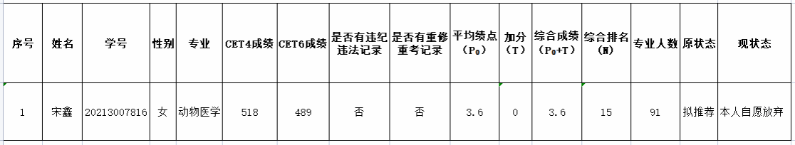 因动物医学专业有一名员工主动放弃推免资格,现对主动放弃推免生资格的名单予以公示,具体见下表。