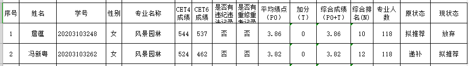 因风景园林专业有一名员工主动放弃推免资格,在专业内按替补顺序推荐,现对调整后的推免生候选人名单予以公示,具体见下表。