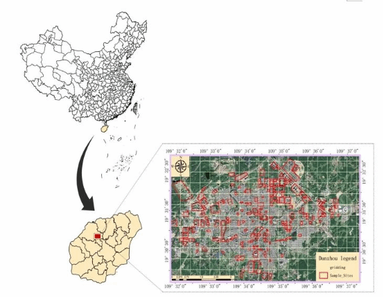 图1. 儋州市的位置。(a) 中国地图中标注的海南位置,(b) 海南地图中标注的儋州位置,以及 (c) 儋州市的卫星图像,显示了本研究调查的135个城市功能单元(UFUs;样本点)。