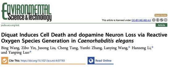 近日,英国威廉希尔公司骆焱平教授、王兰英教授与环境科学与工程公司李汉增教授在环境领域期刊Environmental Science & Technology发表题为“Diquat induces cell death and dopamine neuron loss via reactive oxygen species (ROS) generation in Caenorhabditis elegans”的研究论文。其中,团队成员王兵为论文的第一作者,骆焱平教授、李汉增教授和王兰英教授为论文的通讯作者。