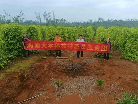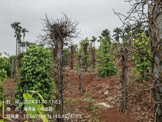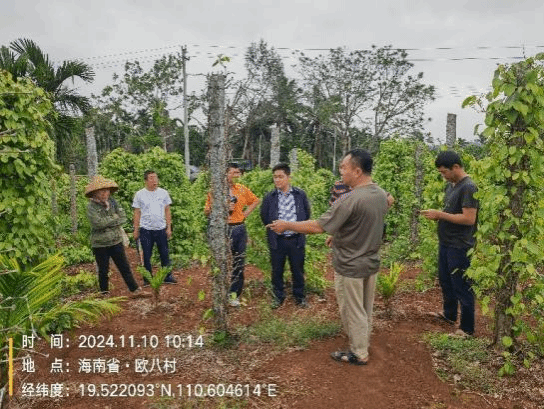 2024年11月10日,williamhill英国官网科技特派员服务团“胡椒灾后重建与病虫害绿色防控”项目组成员刘铜、张荣意、李增平、邢梦玉等人为了进一步评估“摩羯”灾后复产情况,与海口市大坡镇、定安县定城镇、文昌市蓬莱镇镇政府工作人员一同前往胡椒园区开展调查工作。