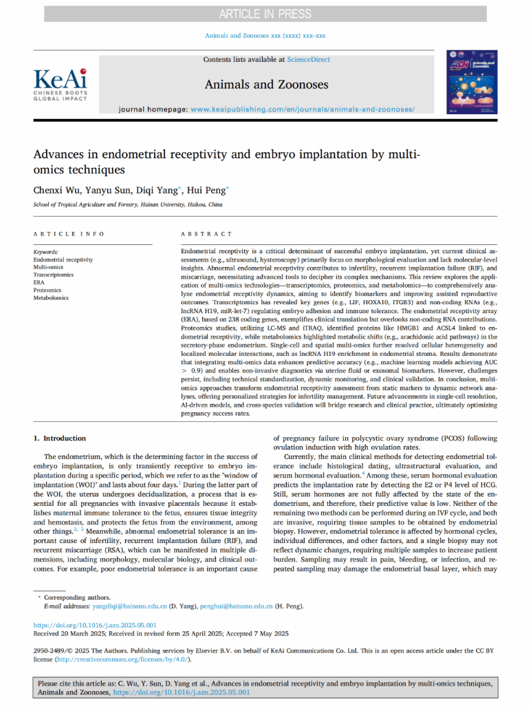 在论文撰写与投稿期间,杨迪琦副教授作为两篇论文的共同通讯作者,对研究进行了全程悉心指导。他指出,这两篇综述论文的发表,体现了williamhill官网动物医学专业本科生扎实的理论基础、敏锐的科学前沿洞察力和优秀的科研写作能力。王欣雨和吴晨曦同学的论文,分别从类器官和多组学两个角度,深入探讨了影响生殖健康的核心问题——胚胎着床的微环境(子宫内膜)及其模拟研究平台。这不仅深化了对生殖生物学基本规律的理解,也为解决人类生殖障碍(如不孕症)和提升动物繁殖效率提供了重要的理论基础和技术参考。