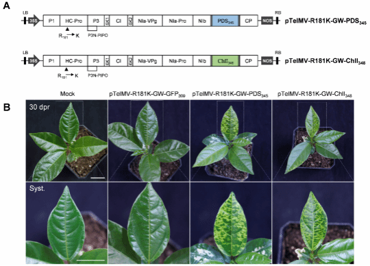 病毒诱导的基因沉默(virus-induced gene silencing, VIGS)技术被广泛用于基因功能研究。夜来香花叶病毒(telosma mosaic virus, TelMV)是百香果中检出率极高的病毒。本研究基于TelMV开发了病毒介导的蛋白过表达载体(virus-mediated protein ove-rexpression, VOX)和病毒诱导的基因沉默载体(VIGS)。该载体具有Gateway体系的重组位点,将其命名为pTelMV-GW,可用于快速克隆相关基因。研究表明:1)该载体可作为VOX载体在百香果中系统且稳定地表达绿色荧光蛋白(green fluorescent protei-n, GFP)和细菌八氢番茄红素合成酶(bacterial phytoene synthase, CrtB)两种外源蛋白;2)可作为VIGS载体沉默百香果八氢番茄红素脱氢酶(phytoene desaturase, PDS)和镁螯合酶I亚基(magnesium chelatase subunit I , CHlI)两个基因,致使其出现光漂白和叶片变黄的表型,但其沉默效果不显著。随后,为了进一步优化该载体的沉默效果,利用课题组前期报道的弱毒疫苗R181K(Wang et al., 2024)构建pTelMV-R181K-GW载体,该载体相较于pTelMV-GW显著沉默了百香果PDS和CHlI基因(图1),沉默效率高达71%和89%,且沉默效果可持续至180天。综上,本研究首次开发了可用于百香果基因功能研究的VOX载体和VIGS载体,为后续百香果产量,农艺性状,抗病性等相关基因功能的研究提供重要工具。