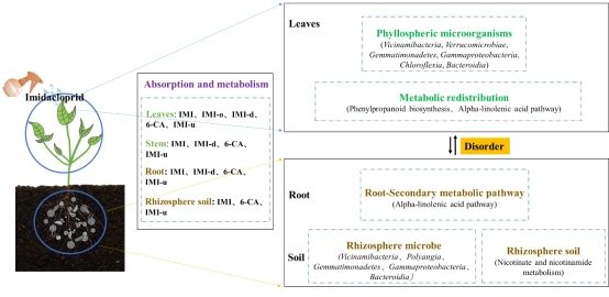 辣椒是热区广泛种植的蔬菜作物,其果实是必须营养素的来源,热区高温高湿的环境条件导致病虫害频繁,生产中通过加大农药施用剂量和频次防治频发的病虫害,加剧农药残留,并对辣椒的安全和产量造成重大隐患。本研究通过模拟田间实际施用,进行吡虫啉叶面喷施,结果表明吡虫啉暴露降低辣椒叶片和根中香豆素等次级代谢物含量。与非靶代谢组的结果一致,吡虫啉施用后影响植物苯丙烷和激素通路,造成其代谢紊乱。此外,残留在土壤中的吡虫啉降低根际土壤中有益微生物的多样性和丰度。吡虫啉的不合理施用干扰根际土壤-植物系统微生物种群和代谢平衡,进而抑制植物生长。本研究提高农药施用对作物潜在影响的认识,为新烟碱类农药施用和生态风险评估提供理论依据。