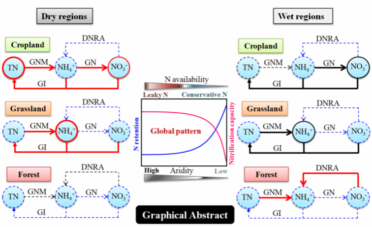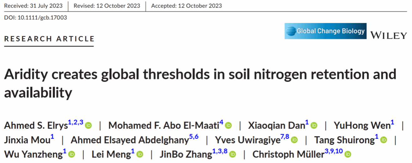 海南大学英国威廉希尔公司张金波教授和孟磊教授团队Ahmed S. Elrys教授发现全球范围内土壤氮固持和有效性存在干旱阈值。该研究成果以“Aridity creates global thresholds in soil nitrogen retention and availability”为题发表在国际知名期刊《Global Change Biology》上。
