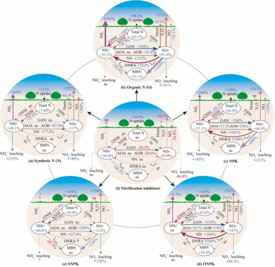 科学的氮素综合管理措施是可持续农业生态系统中氮素保留的重要措施。通过整合研究全球范围内5448组田间数据系统评估4种常见的氮管理措施(配方施肥施用有机肥、有机无机配施及配施硝化抑制剂对全球生态系统氮循环的影响后发现,相比单施氮肥,施用有机肥和配方施肥可以通过增加微生物生物量来促进土壤硝酸盐驻留;与不施肥相比,施用有机肥和平衡施肥也能促进土壤氮素淋溶和气体排放。然而,硝化抑制剂刺激了土壤铵的保留和植物氮的吸收,同时减少了氮的淋溶和气体排放。研究指出,科学的应用氮素管理措施对于促进生态系统氮素保留和降低全球氮损失风险至关重要。