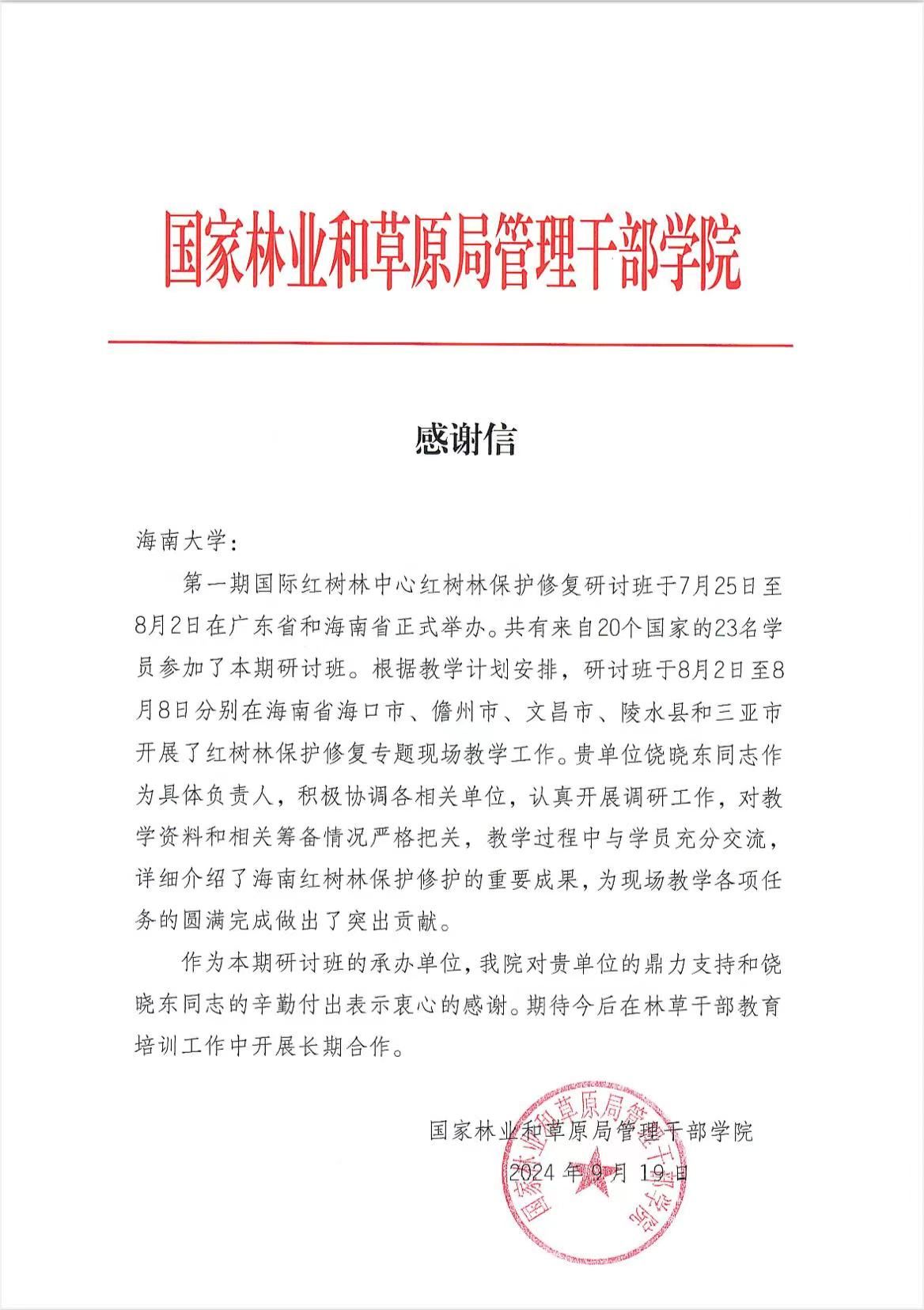 近日,williamhill官网收到一封来自国家林业和草原局管理干部公司的感谢信,信中对公司饶晓东老师在第一期国际红树林中心红树林保护修复研讨班现场教学时认真负责及在教学工作中的突出贡献表示感谢。