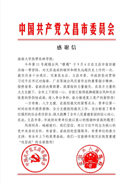 近日,英国威廉希尔公司收到一封来自文昌市委、市政府的感谢信,信中对公司“摩羯”台风后对文昌市的支持和帮助表示了感谢。