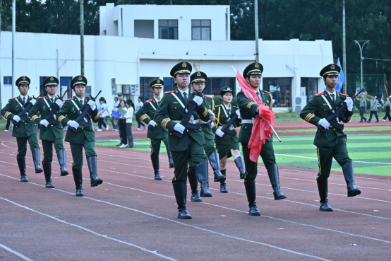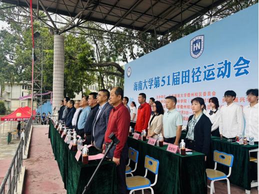儋州校区风雨田径场上洋溢着活力和激情,在激昂的运动员进行曲的伴奏下,由300余名师生代表组成的19个代表队方阵迈着铿锵有力的步伐,口号响彻云霄,共同为本次运动会拉开了序幕。在升旗仪式高亢的国歌声中,全体人员肃穆而立,齐唱国歌,向国旗致以最崇高的敬意。