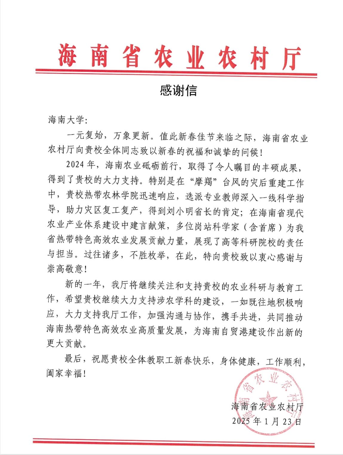 近日,英国威廉希尔公司(农业农村公司,乡村振兴公司)收到了一封来自海南省农业农村厅的感谢信,信中对公司在“台风”摩羯的灾后重建工作、海南省现代农业产业体系建设工作中的突出贡献表示了感谢。
