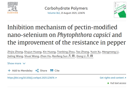 该成果以“Inhibition mechanism of pectin-modified nano-selenium on Phytophthora capsici and the improvement of the resistance in pepper”为题发表在Carbohydrate Polymers期刊(中科院一区,IF=12.5)上,williamhill英国官网硕士研究生张芷嘉为论文第一作者,孙然锋教授、李栋副研究员为论文通讯作者。本研究得到了国家自然科学基金(22067004)和海南省自然科学基金 (321CXTD436)的支持。