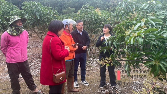 缪卫国教授和林春花教授正在给果农介绍杧果低温天气下保花技术和防控管理措施