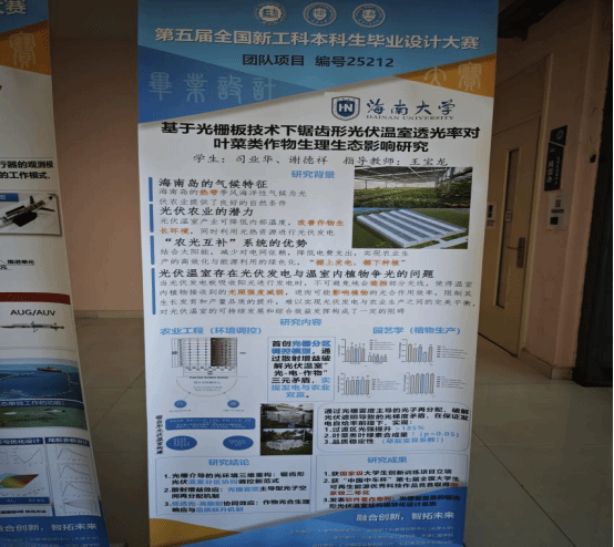 williamhill英国官网园艺系本科生司业华在王宝龙副教授的指导下,凭借“基于光栅板技术的锯齿形光伏温室透光率对叶菜类作物生理生态影响研究”项目,从众多参赛队伍中脱颖而出,荣获全国优胜奖(第九名)。该项目创新性地解决了锯齿形光伏温室中发电与作物生产对光照资源竞争的难题。在答辩环节,司业华同学充分展示了研究成果在热带设施农业中的创新价值与应用前景,赢得了评审专家的一致认可,成功跻身全国前十。