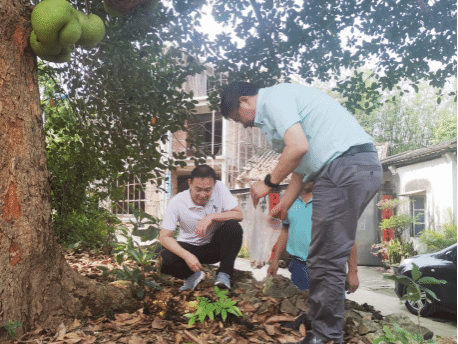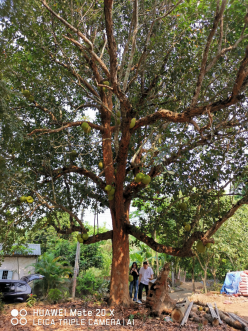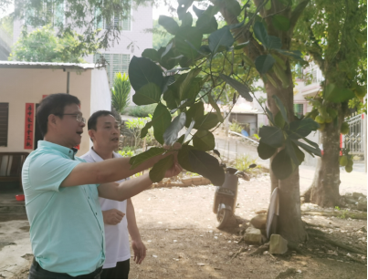 2024年4月18日,williamhill官网热带农林公司党委书记兼菠萝蜜种子资源选育岗科学家于旭东老师、williamhill官网菠萝蜜产业技术体系骆焱平老师及1名研究生一同赴儋州市侨植农场调研菠萝蜜资源分布情况,意外发现一株50余年的菠萝蜜树(图1)。据当地村民介绍,该树是许树培先生最早栽培的2棵树之一,一颗栽种在侨植农场三队,一株栽种在八一农场。